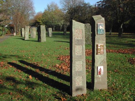 The standing stones with ceramic inserts by the Eisteddfod ring of stones in Swan Meadows that ilustrate some of the history of Lady and Lord Llanover. Lady Llanover was a prime mover in re-establishing the Eisteddfod tradition. The stones were carved by Jane Turner www.stonemasonandcarver.co.uk