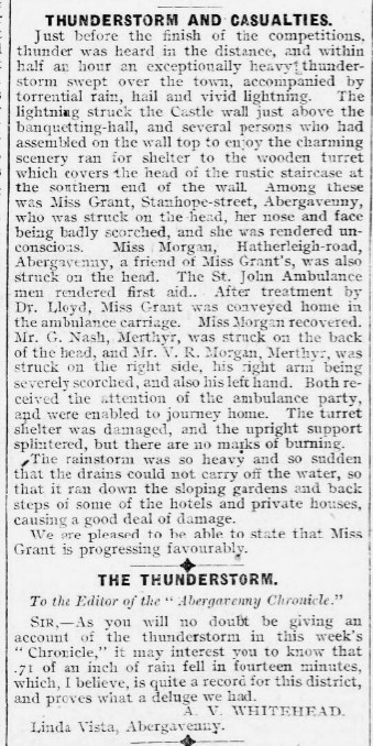 In May 1910 the Amateur Wrestling Championships were held in the Castle grounds. Just before he competitions ended an exceptionally heavy thunderstorm swept over town with torrential rain, thunder and lightning. Several persons on the wall gantry ran for shelter to the wooden turret at the head of the rustic staircase. Miss Grant was struck on the head, her nose and face were badly scorched and she was knocked unconscious. Miss Morgan was also struck on the head. Treatment was given by the St John’s Ambulance men and Miss Grant was taken home in an ambulance. Mr Nash was struck on the back of his head and Mr Morgan had his right arm and left hand severely scorched. Both were able to travel home after treatment. The turret shelter was damaged and the upright support splintered but no marks of burning were seen.