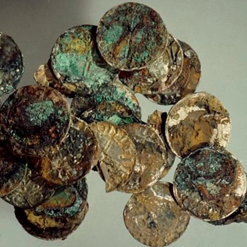 The 199 silver coins all date from the 11th century included some from the time of the Anglo-Saxon King Edward the Confessor and the Norman King William the Conqueror. They are all about 2cm in diameter and when found were stuck together with iron deposits and traces of fabric, so it seemed they been buried in a cloth bag. The coins had been struck in 36 different mints including Hereford and Bristol (there were no mints in Wales) by a number of different people authorised to produce coins. The value of the hoard would have been about three month’s wages.